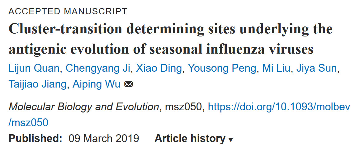 1. Lijun Quan, Chengyang Ji, Xiao Ding, Yousong Peng, MiLiu,Jiya Sun,Taijiao Jiang, Aiping Wu. Cluster-transition determining sitesunderlying the antigenic evolution of seasonal influenza viruses. MolecularBiology and Evolution, msz050, https://doi.org/10.1093/molbev/msz050