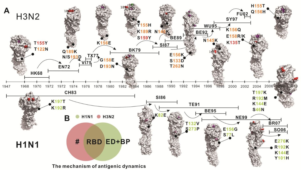 流感病毒的頻繁突變,使得病毒能夠快速地逃避宿主的免疫壓力,導致毒株間顯著的抗原變異、流感的季節(jié)性流行以及疫苗保護的失效等。而季節(jié)性流感A(H1N1)和A(H3N2)的反復變異和流行,給人類社會帶來了巨大的公共衛(wèi)生壓力和疾病負擔。因此,對于季節(jié)性流感病毒抗原變異規(guī)律的研究,不僅有助于我們深入掌握病毒的進化變異趨勢,還能直接指導流感疫苗株的選取,具有重要的理論意義和實際價值。