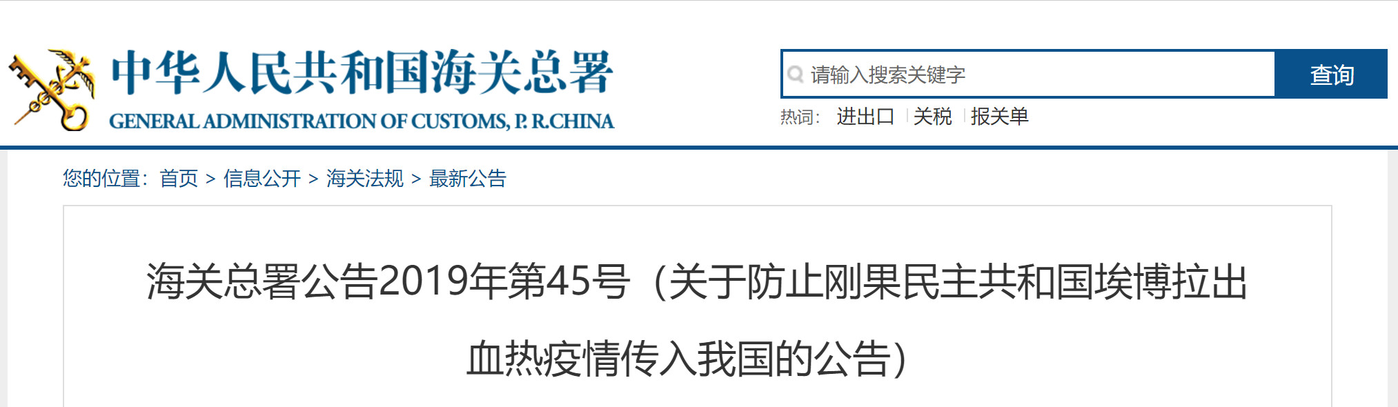 1.海關(guān)總署公告2019年第45號(關(guān)于防止剛果民主共和國埃博拉出血熱疫情傳入我國的公告)