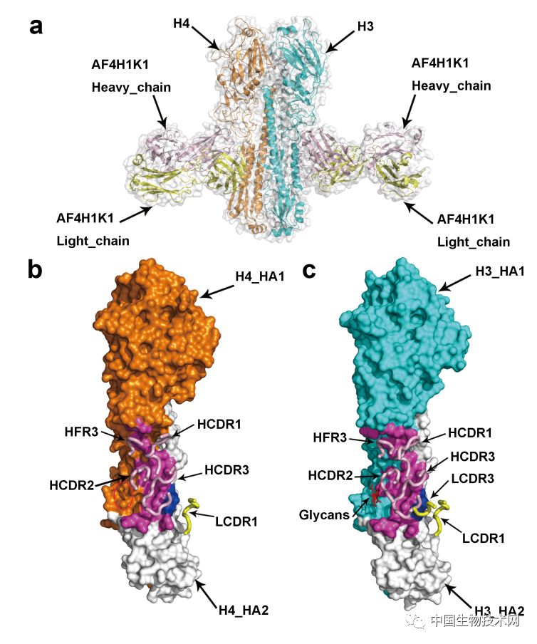由中國科學(xué)院院士高福帶領(lǐng)的中國科學(xué)院天津工業(yè)生物技術(shù)研究所蛋白質(zhì)工程與疫苗實驗室研究團(tuán)隊,一直致力于流感病毒、黃熱病毒和登革熱病毒等中和抗體的研制與作用機(jī)制研究。近日,高福團(tuán)隊在甲型流感病毒的治療性抗體研究方面取得新進(jìn)展。團(tuán)隊利用第二代高通量測序的篩選方法,從H7N9患者體內(nèi)獲得一株可在體外中和H3、H4和H14等亞型流感病毒的人源單克隆抗體AF4H1K1,并在小鼠體內(nèi)證實該抗體對H3亞型流感病毒和H7N9高致病性禽流感病毒具有高效的保護(hù)性。團(tuán)隊用晶體學(xué)方法解析了AF4H1K1與H3及H4亞型血凝素蛋白的復(fù)合物結(jié)構(gòu),從分子水平闡明了該抗體結(jié)合于血凝素蛋白的莖部區(qū)。此外,團(tuán)隊深入研究了抗體輕鏈對整個抗體的抗原結(jié)合、病毒中和等效力的影響,并從結(jié)構(gòu)上進(jìn)行了分析、闡述。研究結(jié)果表明,抗體同一重鏈與不同輕鏈配對后可導(dǎo)致抗體對抗原的結(jié)合發(fā)生改變,甚至改變抗體的中和范圍。該研究首次詳實地在分子水平上闡釋了輕鏈對流感病毒廣譜中和抗體活性的貢獻(xiàn),為通過靶向輕鏈來設(shè)計更具潛力的廣譜中和抗體提供了理論支持。