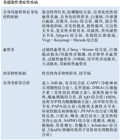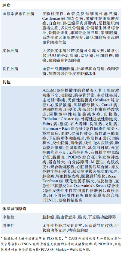 NIID患者中,大血管炎、風(fēng)濕性多肌痛、結(jié)節(jié)病、家族性地中海熱和成人Still病是FUO相當(dāng)常見的診斷。遺傳性自身炎癥綜合征非常罕見,通常年輕人多見。雖然大多數(shù)腫瘤都出現(xiàn)發(fā)熱,但迄今為止最常見的FUO腫瘤相關(guān)診斷是惡性淋巴瘤,有時發(fā)熱比體檢觸及淋巴結(jié)腫大更早出現(xiàn)。其他FUO原因中除了藥物引起的發(fā)熱和運(yùn)動引起的過熱外都不常見。