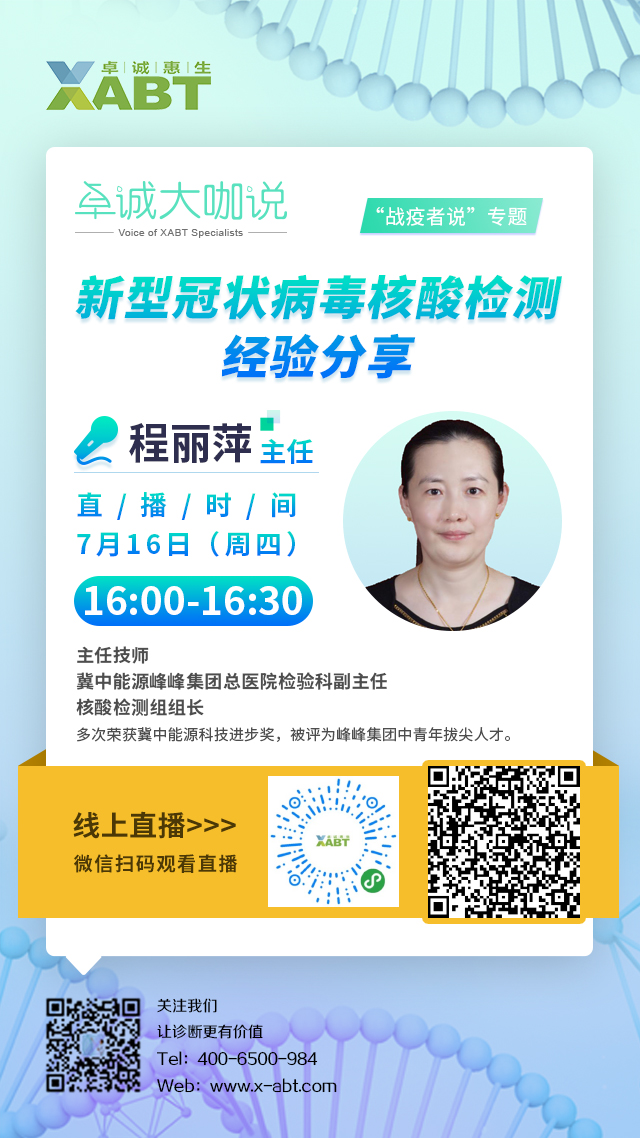 卓誠大咖說之“戰(zhàn)疫者說”專題第三期將于7月16日16:00正式開播,我們非常榮幸邀請到冀中能源峰峰集團總醫(yī)院檢驗科程麗萍主任為我們帶來《新型冠狀病毒核酸檢測的經驗分享》的主題講座,期待各位屆時蒞臨直播間,共同學習,互相啟發(fā)!